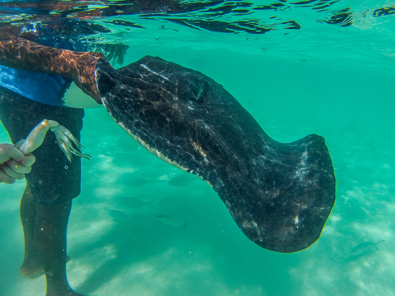 Seuraavana saarena oli Antigua. Kuten kaikki aiemmat, tämäkin oli todella pieni saari ja tähän mennessä vauraimman näköinen ja oloinen. Olimme varanneet retkeksi Stingray Swim and Snorkel tourin. Satamasta jälleen bussin kyytiin ja kohti tapahtumapaikkaa. Koska kyseessä oli uinti keihäsrauskujen kanssa, turvallisuus oli ykkösasia. Pienen turvallisuusinfon jälkeen varusteiden hakuun ja veneeseen. Alle 10 minuutin venekyydin jälkeen saavuimme Stingray Cityyn, matalahkoon alueeseen keskellä merta, joka suorastaan kuhisi keihäsrauskuja ja muita värikkäitä pikkukaloja. Alueella meitä opastettiin liikkumaan jalkoja raahustaen ettei vaan astuisi vahingossa rauskun päälle. Ja herranjestas nämä otukset olivat valtavia! Pakko myöntää, että hieman jännitti, vaikka oppaat sanoivatkin ettei siihen ole mitään syytä. Rauskut kun pistävät vain ja ainoastaan säikähtäessään, joten rauhallisuus oli avainsana. Pääsimme syöttämään rauskuja kädestä ja K sai rauskulta myös selkähieronnan 🙂 Ja syöttäessä K:n peukalokin meinasi mennä kalmarin mukana rauskun suuhun, sillä nämä imaisevat ruuan noin 10 cm päästä suuhunsa, kuin imurit. Snorklausmahdollisuudet olivat paikalla aika heikot, sillä vesi oli täynnä pientä valkoista hiekkaa, joka teki näkyvyydestä heikon. Samoin mielessä pyöri jatkuvasti ajatus ”älä astu rauskun päälle”. No hengissä selvittiin ja päätimme palata takaisin laivalle. Satamassa oli ties minkälaista retkentarjoajaa ja muuta onnen onkijaa. Kohdallemme osui todella mukava iäkkäämpi rastatukkainen Aloe vera -kauppias, joka näytti meille tuoreen ja aidon aloe veran taiat. Kumpikin olimme sieltä täältä hieman punaisia aurinkorasvasta huolimatta ja aloe vera todella poisti tuon punotuksen, viilensi ihon ja poisti jopa finnit. Ja tämä ei ollut mainontaa 😀 Olo kärähtäneen ihon kanssa todella helpottui aloevoitelun jälkeen. Ilmeisesti Floridan ja Karibian aurinko olivat tehneet tehtävänsä, sillä M:ää luultiin puerto ricolaiseksi tämän rusketusasteesta päätellen 😀